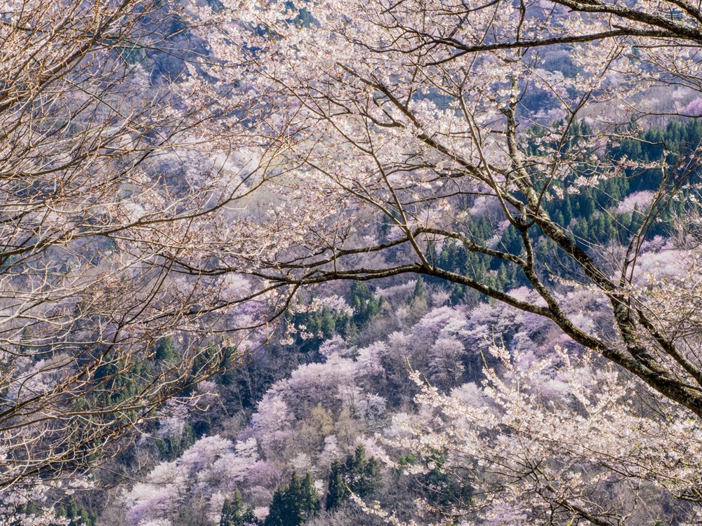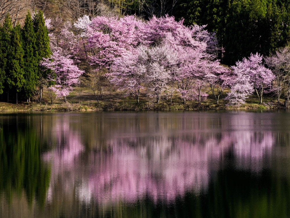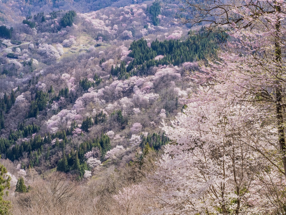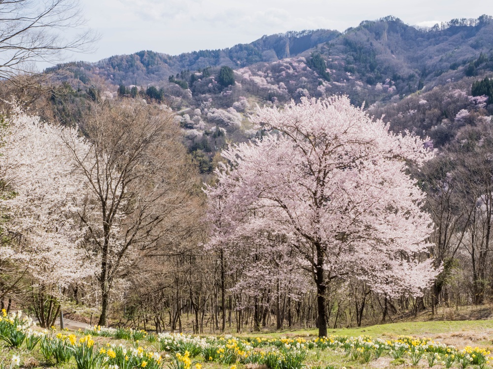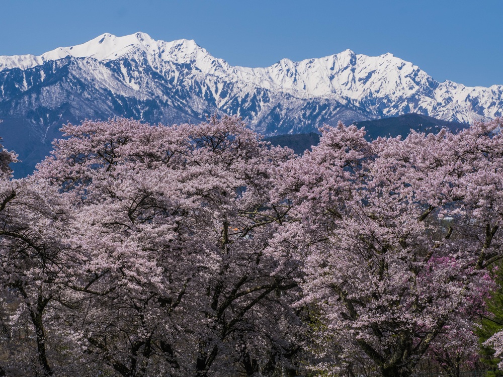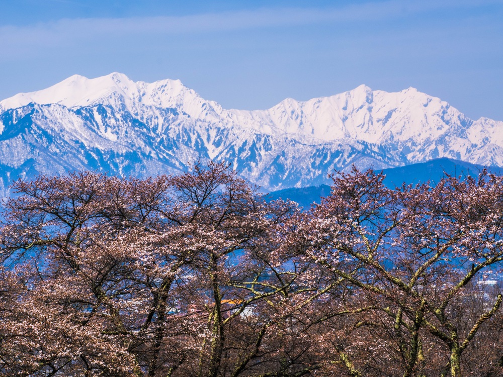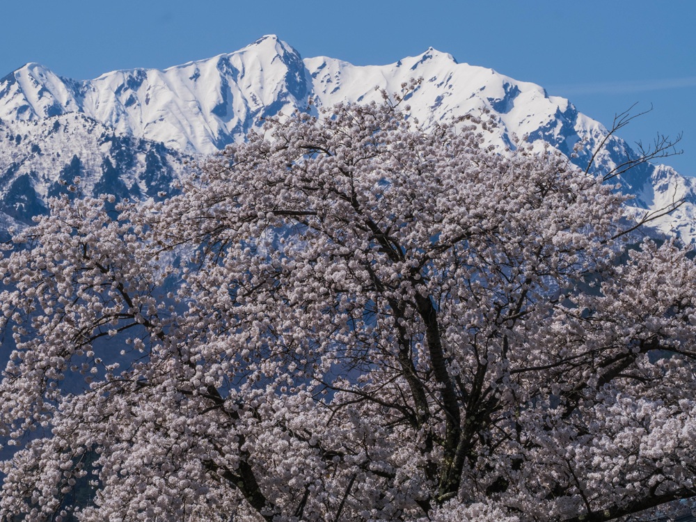 『満開の桜と爺ヶ岳と鹿島槍ヶ岳』