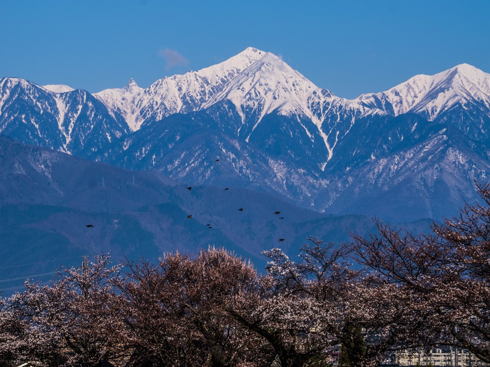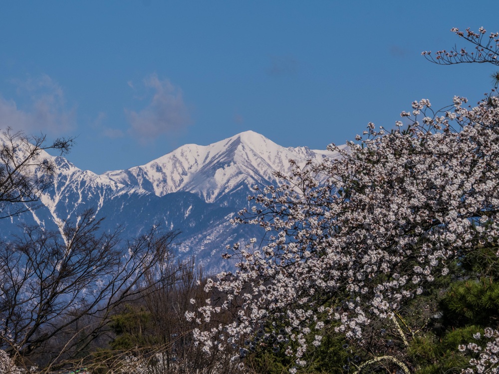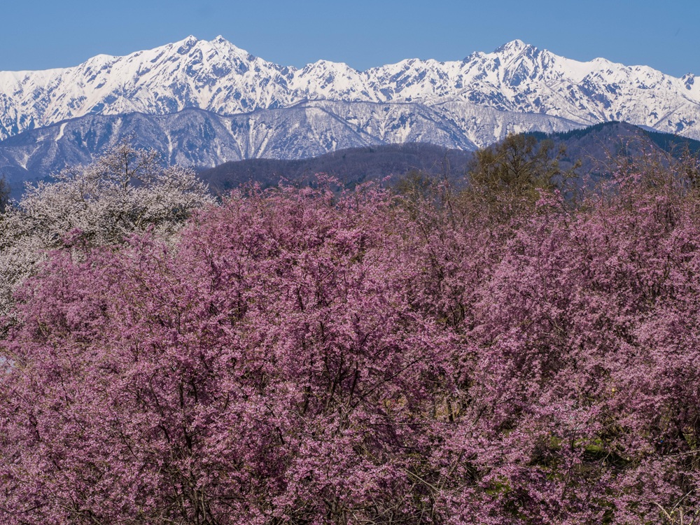 『梅と桜と常念岳』
