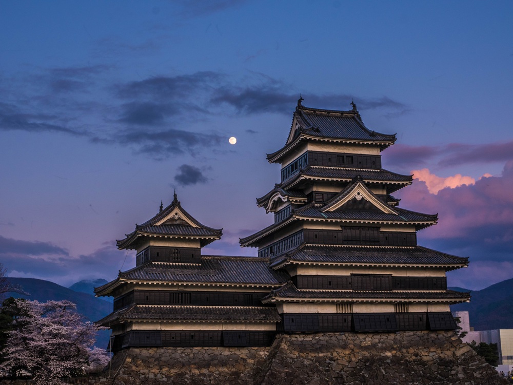 『春の夕暮れの松本城』
