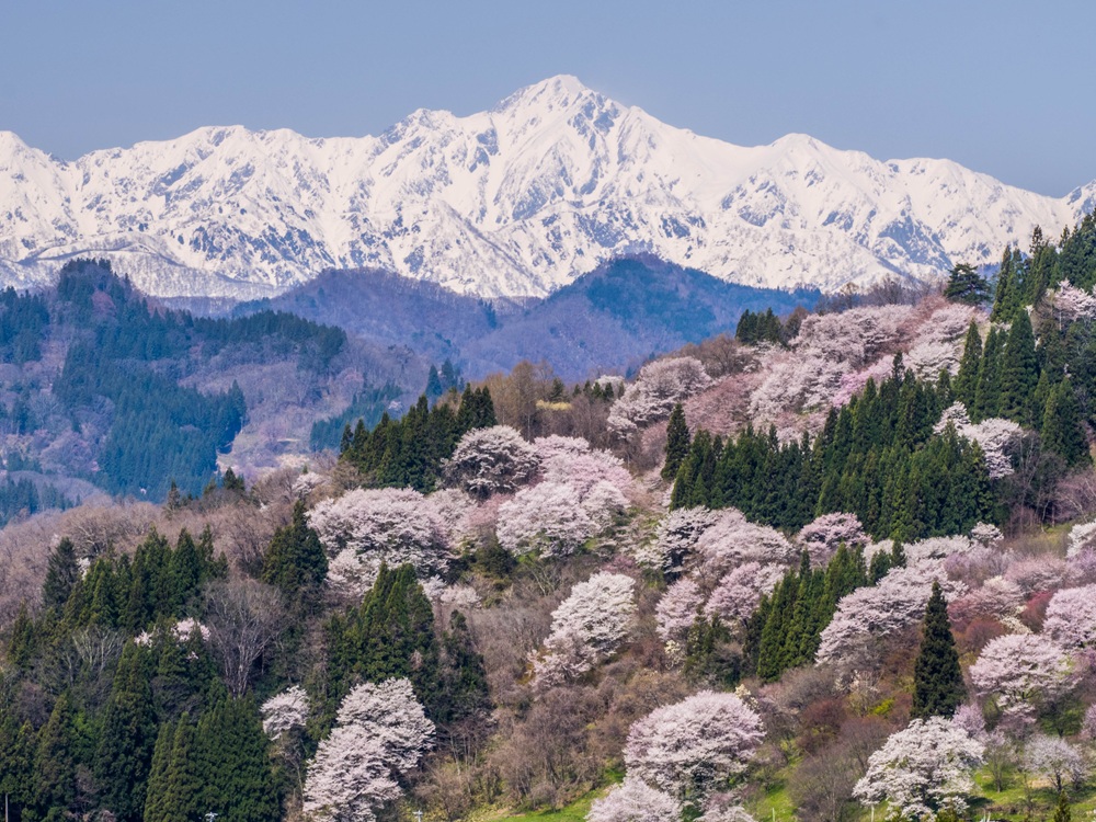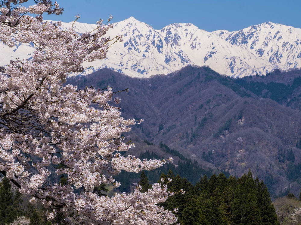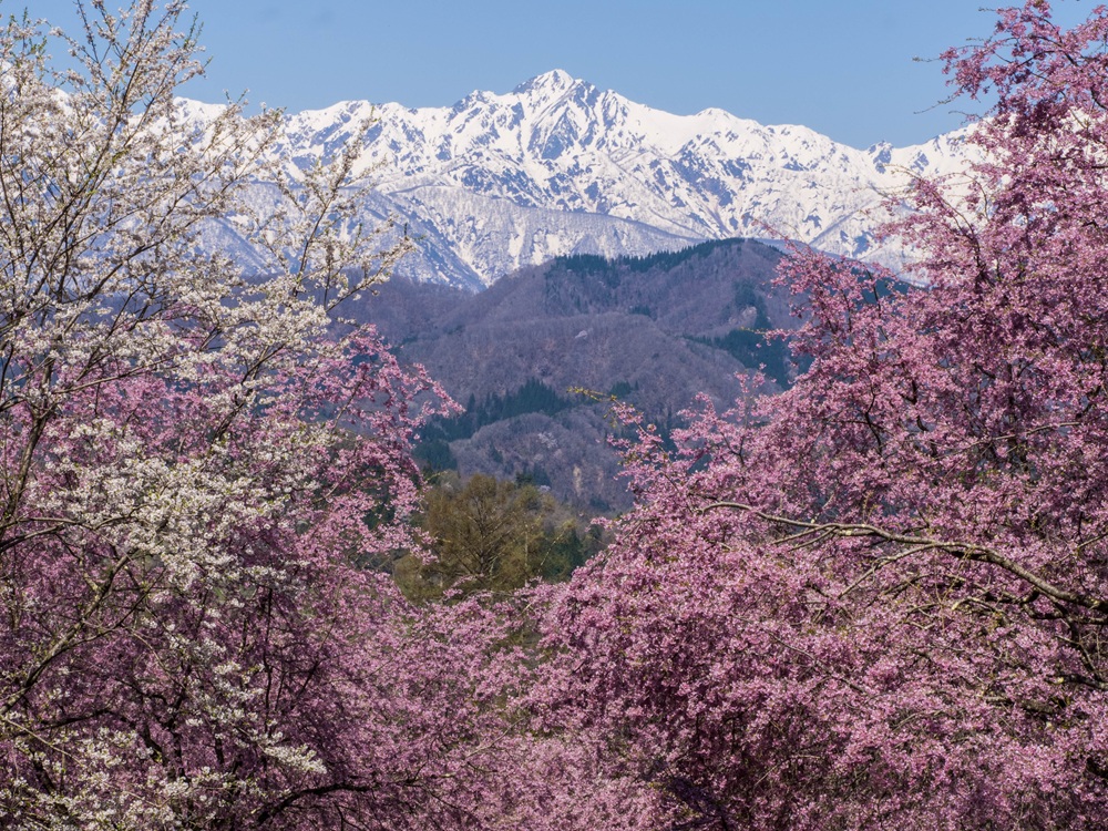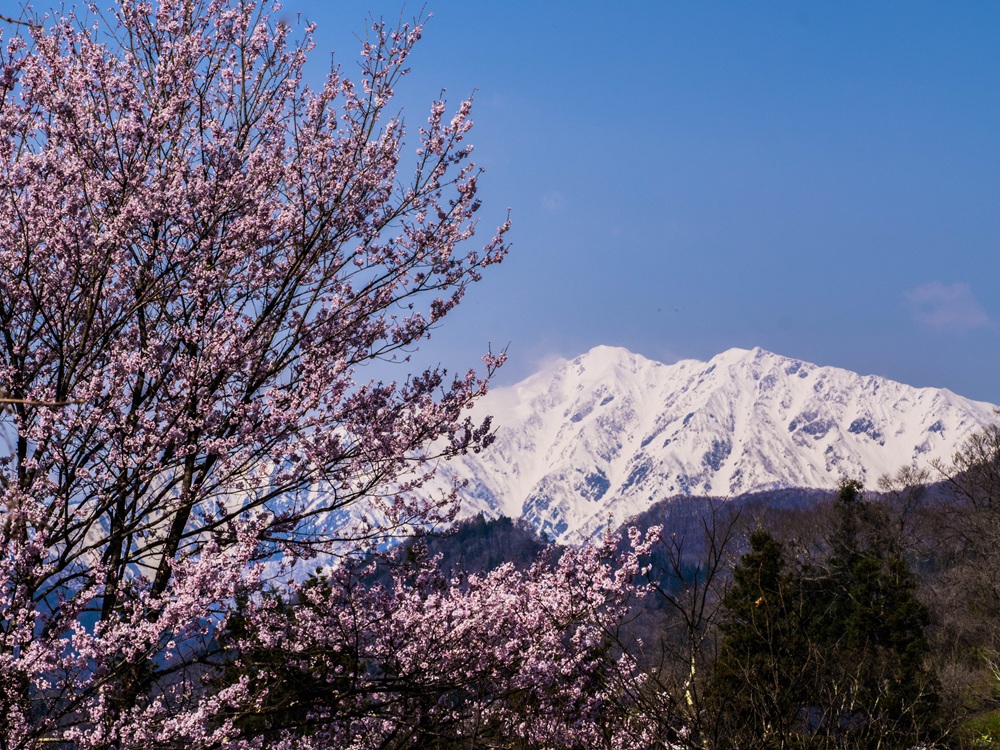 『満開の桜と爺ヶ岳と鹿島槍ヶ岳』
