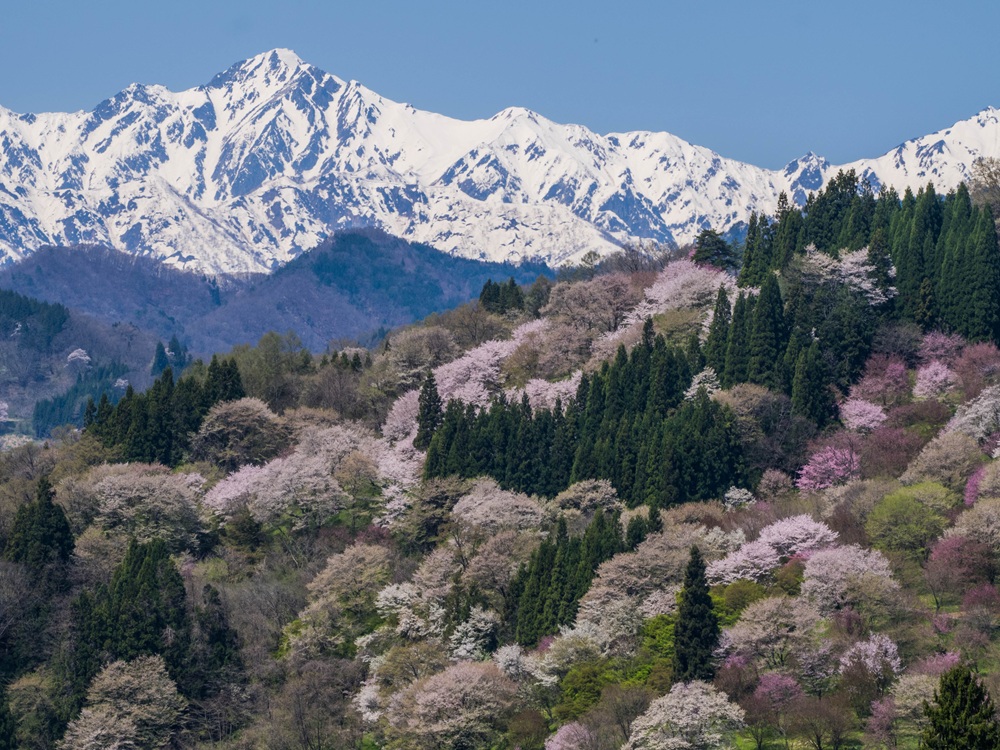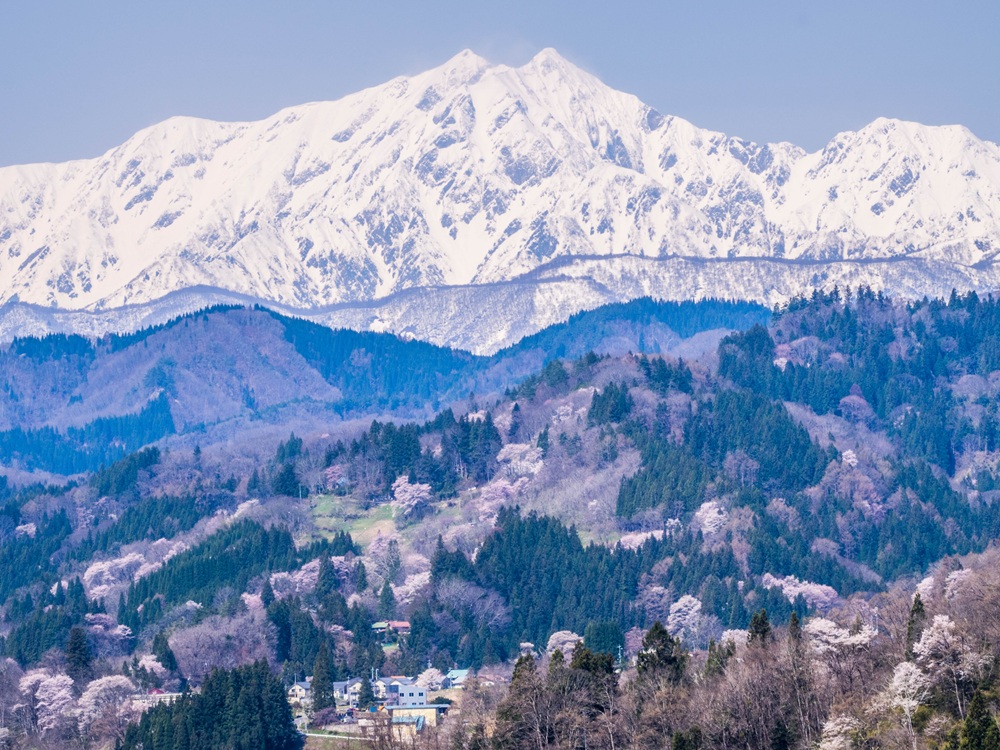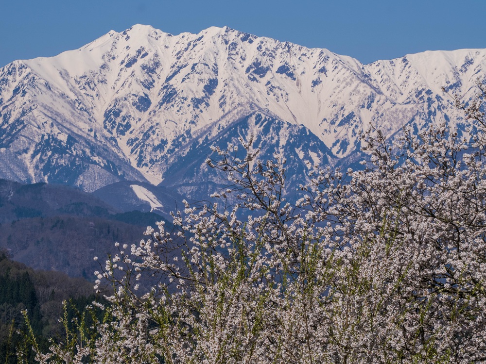 『桜と残雪の爺ヶ岳』